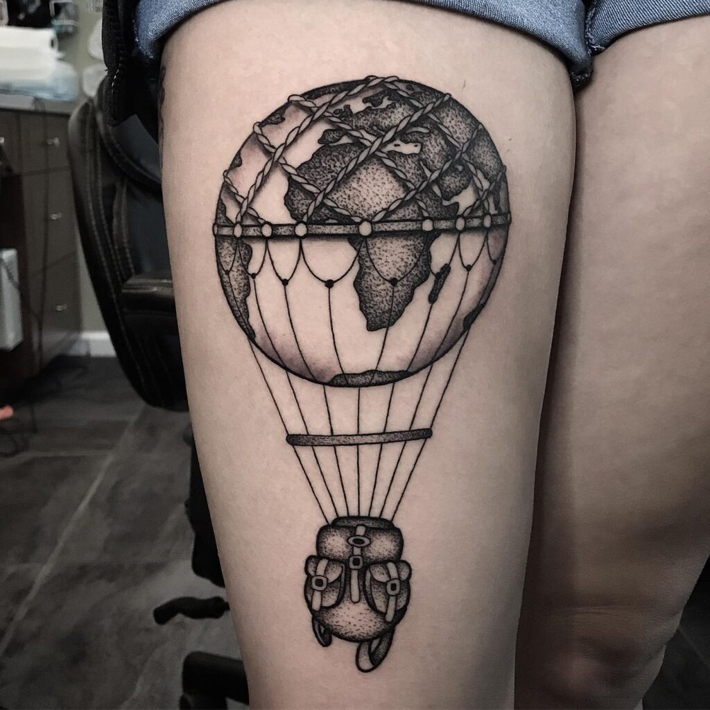 This creative tattoo merges cartography with aviation by turning the balloon into a globe. The continents are shaded with dotwork detail, creating a textured, vintage feel. Suspended beneath, a detailed basket anchors the global canopy, tying together the theme of exploration.