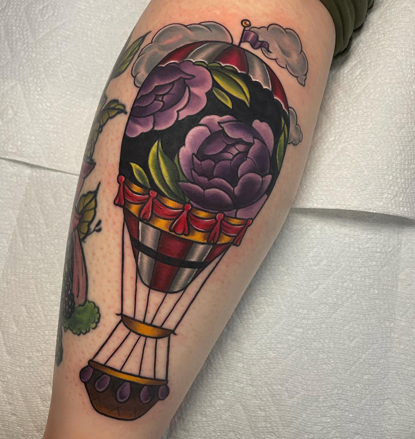The striking color palette makes this tattoo feel both royal and uplifting. It symbolizes joy, prosperity, and positivity while embodying a playful sense of adventure. The floral basket grounds the design, connecting the elegance of the balloon to the natural world.