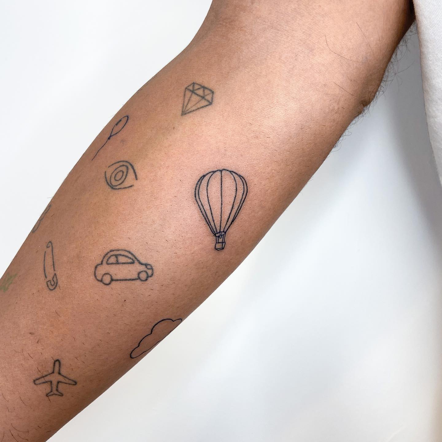 This tattoo embraces minimalism with a simple, fine-line outline of a hot air balloon. Stripped of color and heavy detail, it captures the essence of flight in its purest form. Its placement among other minimalist icons creates a cohesive, sketchbook-like aesthetic.