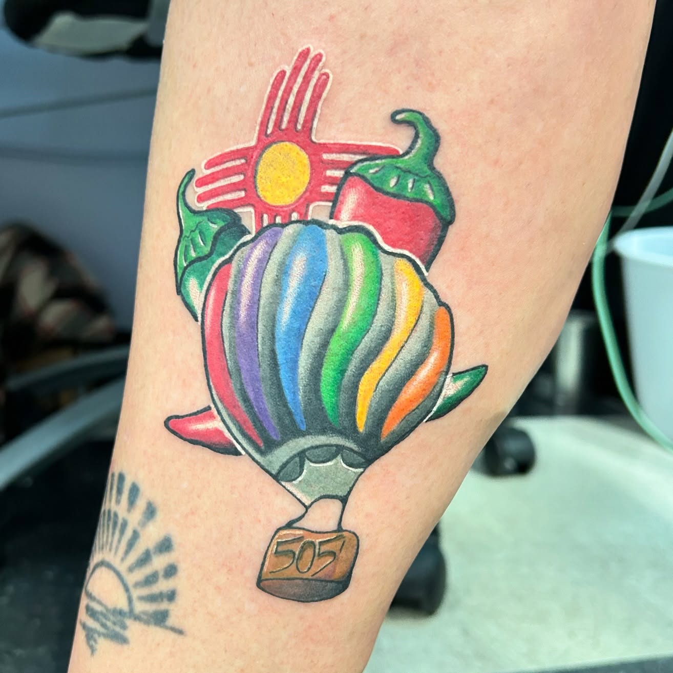 This tattoo celebrates regional pride with a colorful balloon shaded in rainbow tones, flanked by chili peppers and a sun symbol above. The basket bears the number “505,” representing New Mexico’s area code, tying the design to its cultural roots.