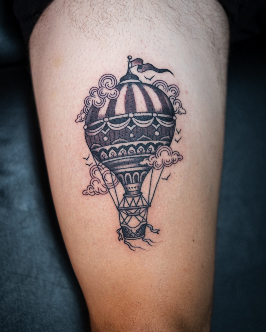 This tattoo opts for monochrome elegance, using black and gray shading to build depth and texture. The balloon is decorated with swirling clouds, striped panels, and ornamental patterns, creating a vintage and mysterious atmosphere.
