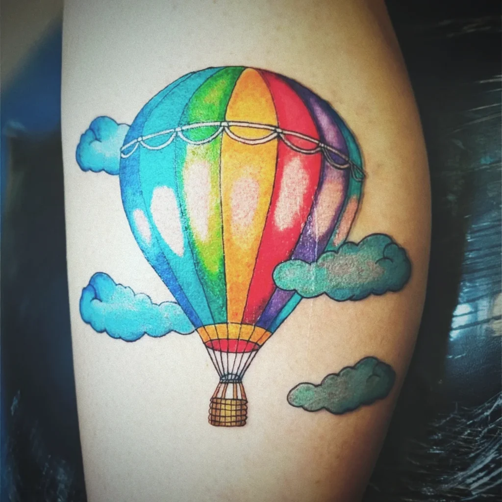 This tattoo bursts with cheerful energy, showcasing a rainbow-colored balloon floating among soft blue clouds. Its spectrum of colors—red, orange, yellow, green, blue, and purple—represents joy, diversity, and boundless optimism. The balloon’s simple wicker basket anchors the colorful scene, reinforcing the idea of stability in flight.