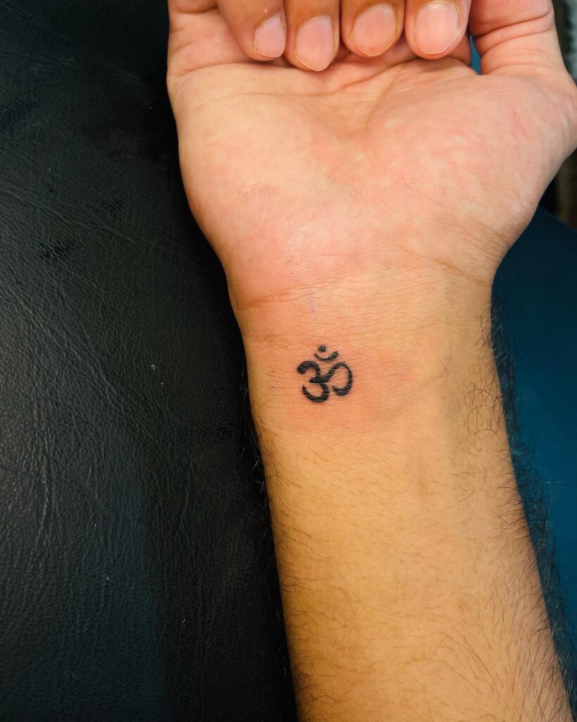 This minimalist tattoo of the sacred Om symbol sits powerfully on the wrist, radiating spirituality and inner peace. Om is considered the sound of the universe in Hinduism and Buddhism, symbolizing creation, consciousness, and ultimate reality. Its small but bold placement makes it a constant reminder of meditation, mindfulness, and harmony.