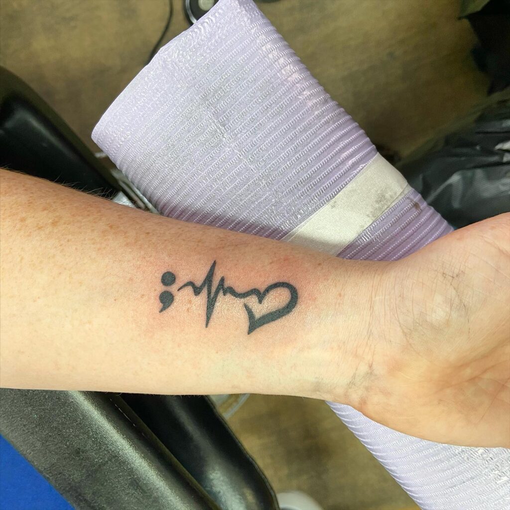 This striking tattoo combines a semicolon, a heartbeat line, and a heart outline into one powerful design. The semicolon symbolizes resilience and survival, often representing strength against mental health struggles. The heartbeat signifies life and continuity, while the heart adds love and hope.