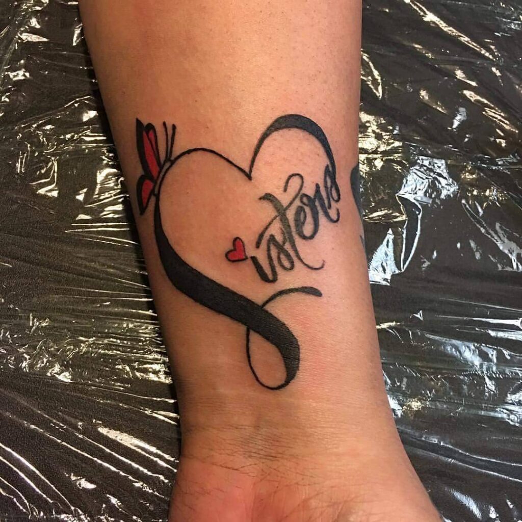 This bold wrist tattoo celebrates sisterhood with a heart-shaped design containing the word “Sisters.” The heart is decorated with tiny red accents and a butterfly element, symbolizing love, transformation, and everlasting bonds.