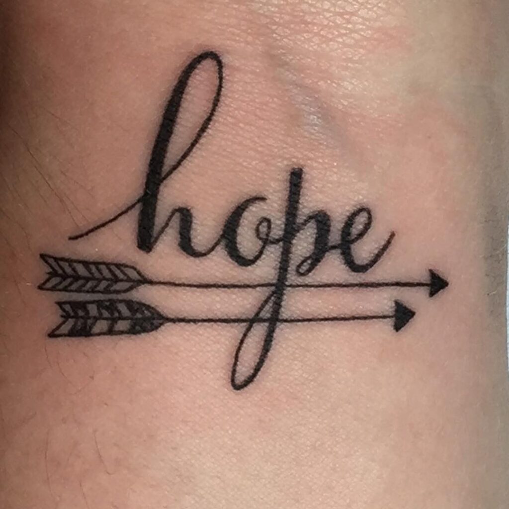 This inspirational wrist tattoo features the word “hope” in elegant cursive, crossed with two arrows pointing forward. Hope is a universal symbol of optimism and faith, while arrows represent direction, progress, and strength. Together, they create a motivational reminder to keep moving forward despite obstacles.