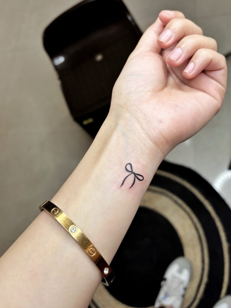 This minimalist tattoo depicts a small bow tied delicately on the wrist, resembling a string or ribbon. Bows symbolize femininity, beauty, and the idea of holding things together, making this design both cute and meaningful. Its dainty size and placement make it look almost like an accessory, elegant enough to resemble permanent jewelry.