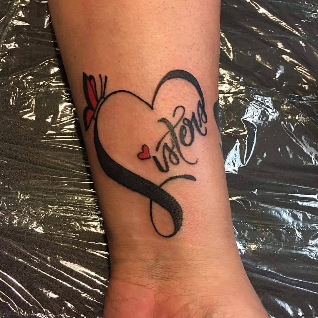 The use of both black and red ink creates contrast, making the tattoo eye-catching and vibrant. It’s a meaningful tribute to sibling love, highlighting the unbreakable connection between sisters. Positioned on the wrist, it serves as a constant reminder of support and shared memories. Perfect for siblings who want matching tattoos or a personal dedication, this design is both affectionate and artistically expressive.