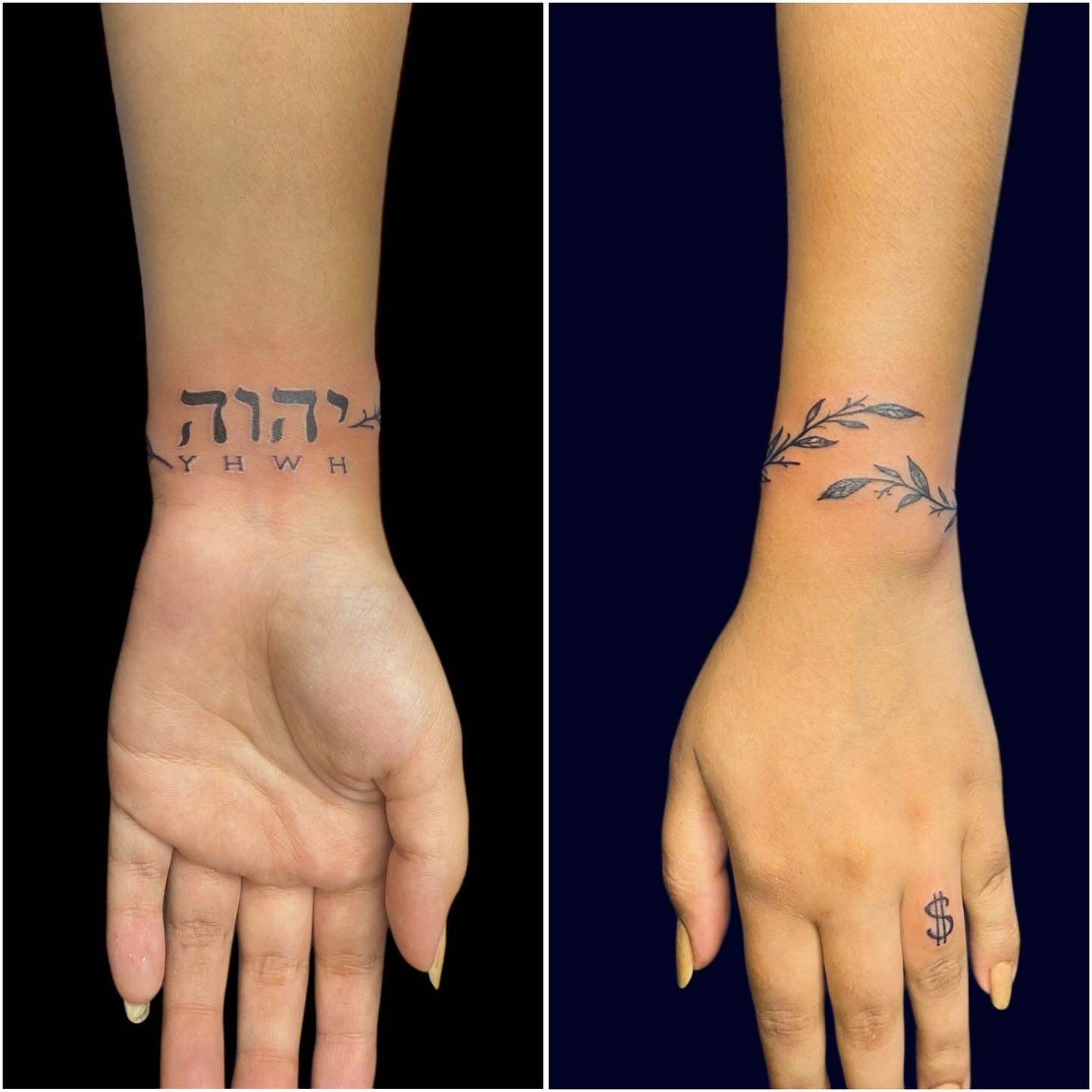 This creative wrist tattoo combines spirituality and nature in two designs: one side features “YHWH” in Hebrew, a sacred name of God, while the other side wraps the wrist with a leafy vine bracelet.
