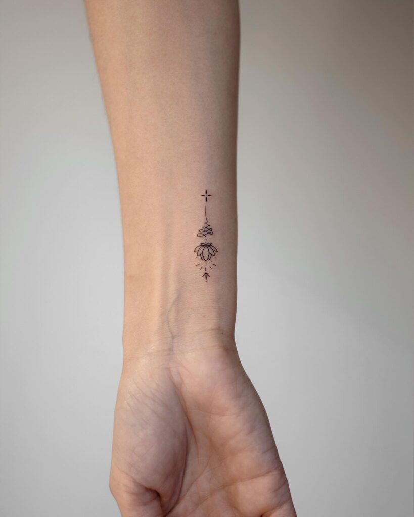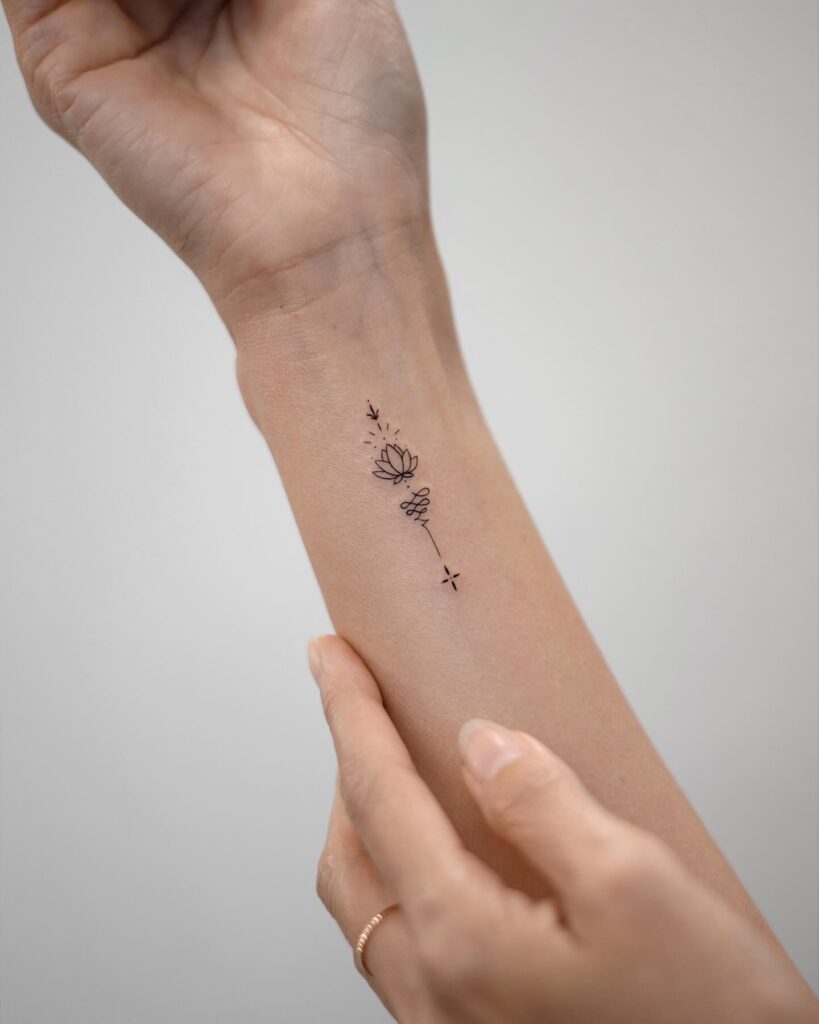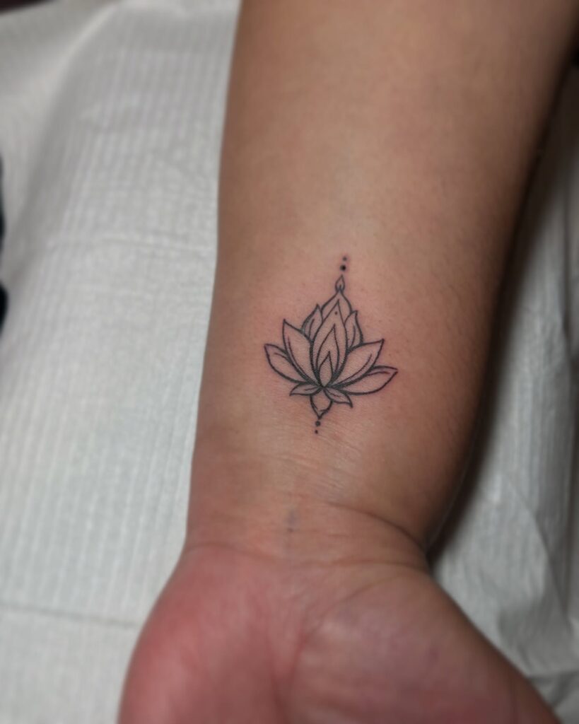 This elegant wrist tattoo features a lotus flower drawn with fine black lines and delicate dot detailing. The lotus is a powerful symbol of purity, enlightenment, and resilience, as it blooms beautifully even in muddy waters.