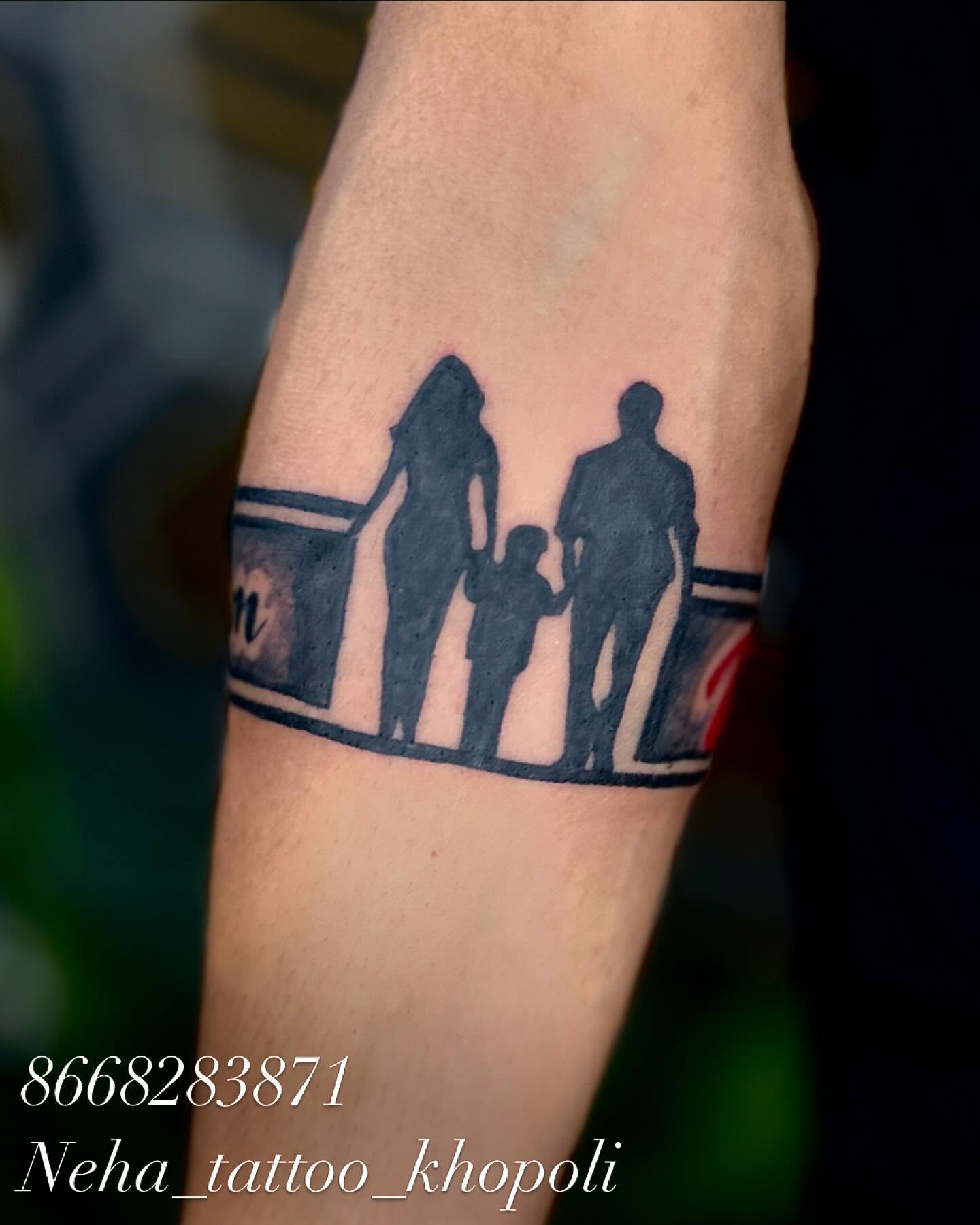 A powerful representation of unity, this tattoo features a silhouette of a mother, father, and child holding hands, wrapping around the arm like an armband. The solid black design emphasizes strength and togetherness while highlighting the central role of family.