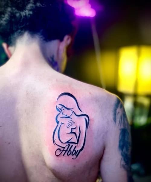 This tattoo radiates warmth through a graceful outline of a mother tenderly embracing her child. The inclusion of the name “Abby” personalizes the artwork, making it a deeply intimate tribute.