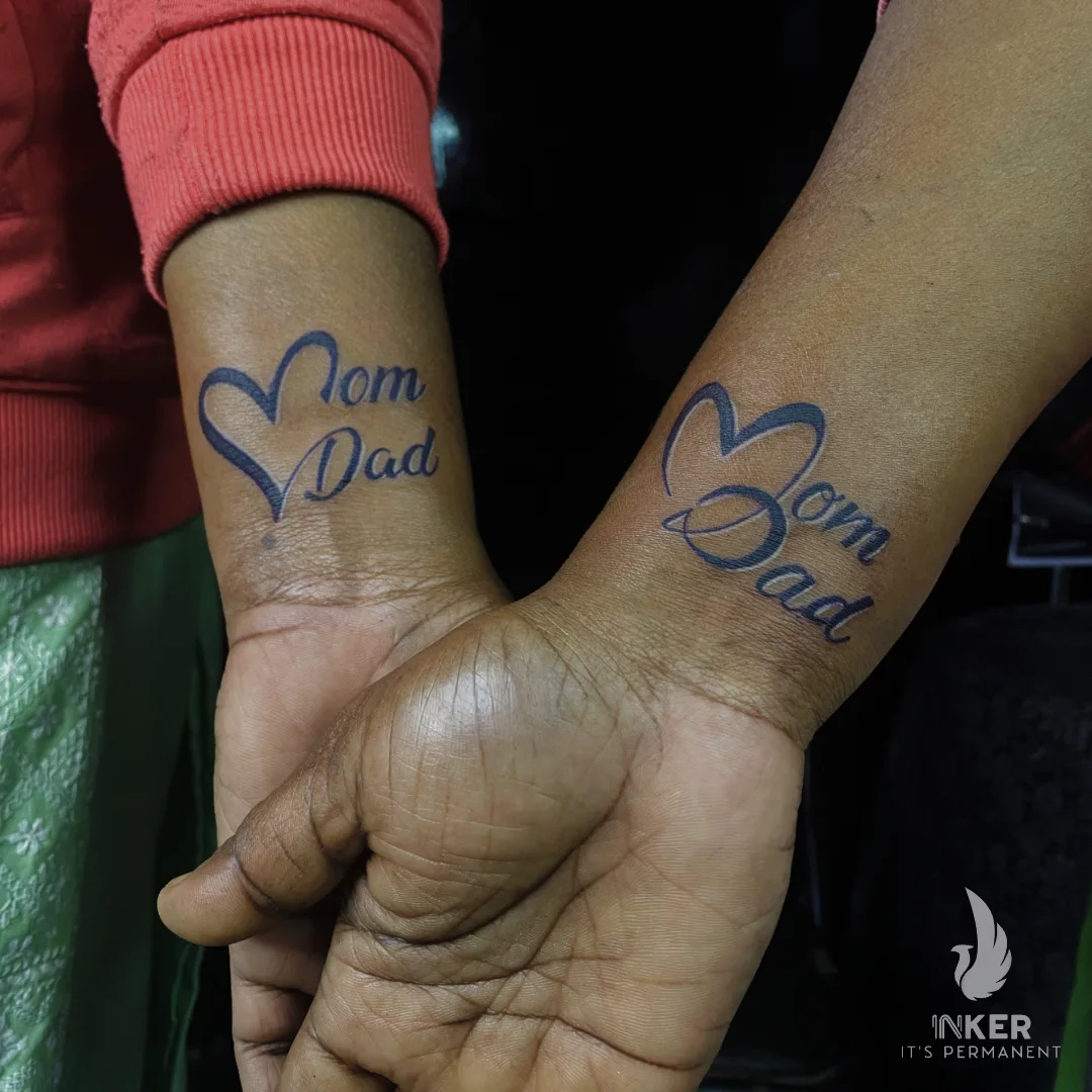Simple yet profound, these matching wrist tattoos feature the words “Mom” and “Dad” enclosed within a heart-shaped outline. Worn by two individuals, they symbolize shared love and appreciation for parents, creating a mirrored bond between siblings, partners, or close family members.