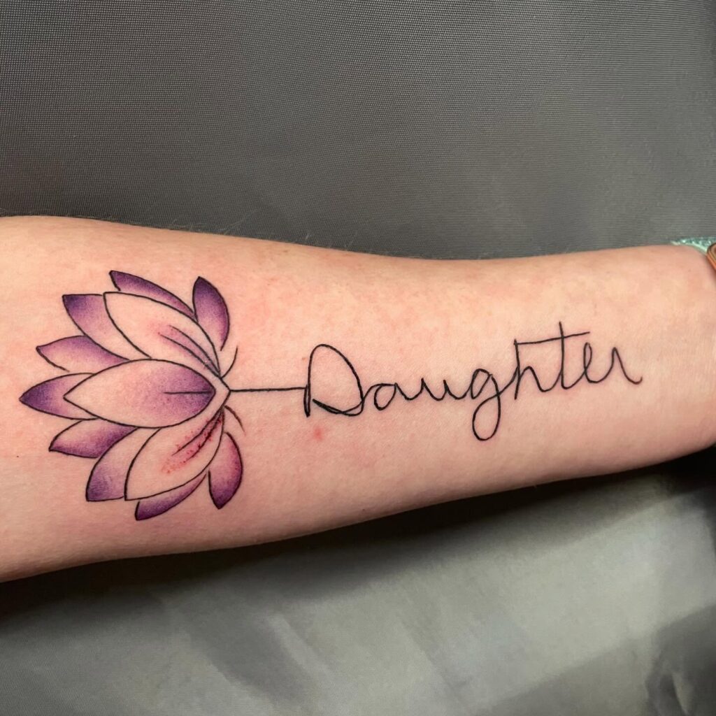 A delicate fusion of florals and words, this tattoo features a beautifully shaded purple lotus with the stem extending into the script “Daughter.” Symbolizing purity, growth, and resilience, the lotus flower represents the nurturing strength of a mother, while the word “Daughter” reinforces the bond between parent and child.
