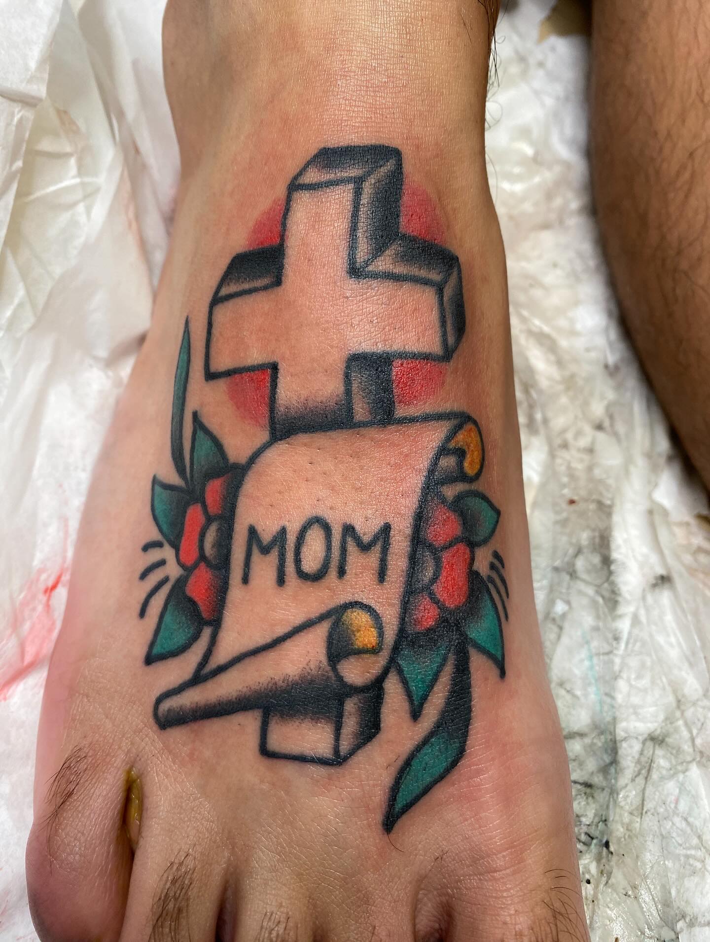 Bold and colorful, this tattoo features a traditional cross with a scroll bearing the word “MOM,” surrounded by vibrant flowers. Placed on the foot, it symbolizes faith, remembrance, and eternal love for one’s mother.