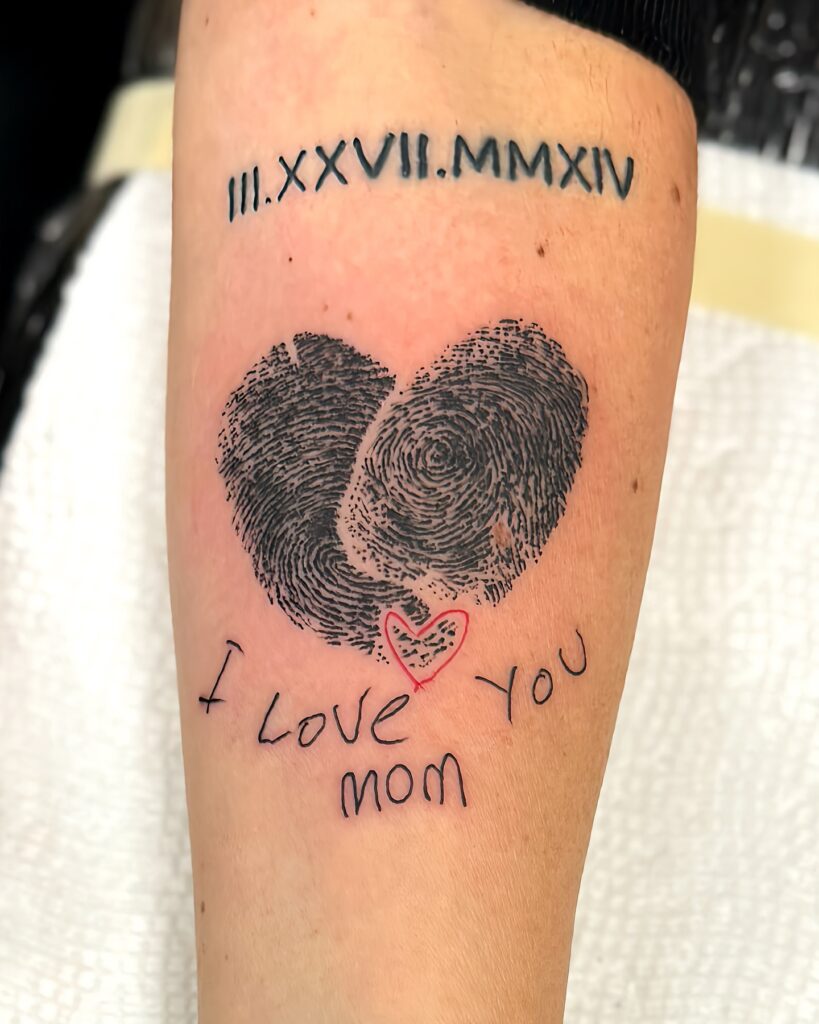 This tattoo uniquely combines fingerprints shaped into a heart, accompanied by Roman numerals and a heartfelt message: “I Love You Mom.” The fingerprints symbolize individuality and irreplaceable bonds, while the Roman numerals may represent a special date like a birthday or anniversary.