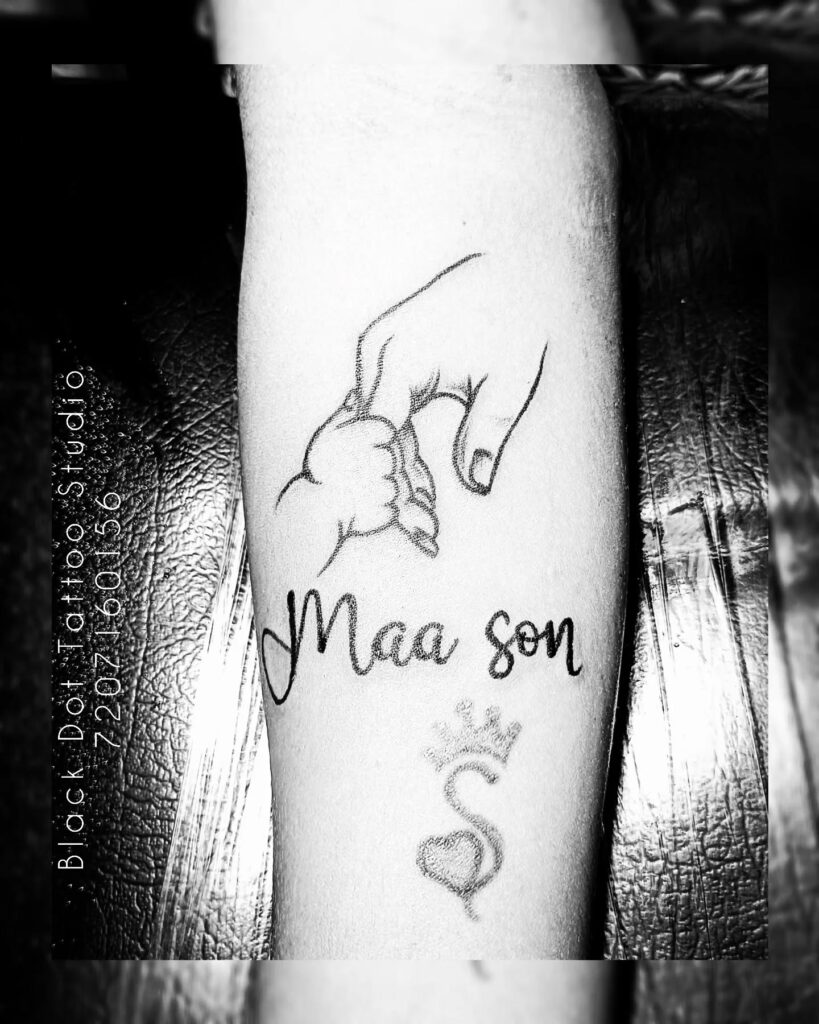 This tender tattoo depicts a baby’s tiny hand grasping the finger of an adult, symbolizing the unbreakable bond between a mother and child. The words “Maa son” add clarity and personalization, making it a heartfelt dedication.
