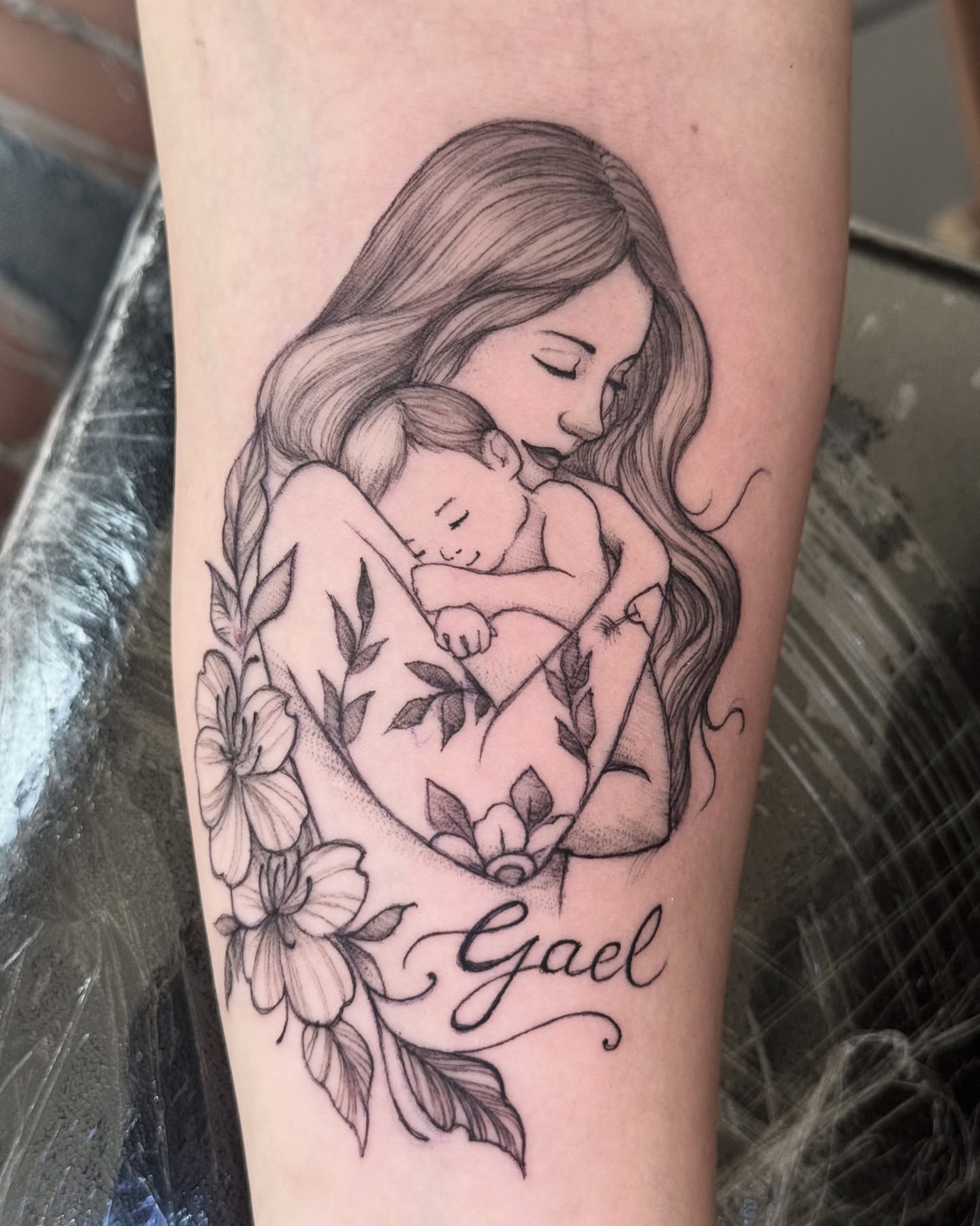 This highly detailed tattoo captures the tenderness of a mother embracing her sleeping child, surrounded by floral elements. The name “Gael” adds a personal touch, making it not just a design but a lasting memory etched in ink.