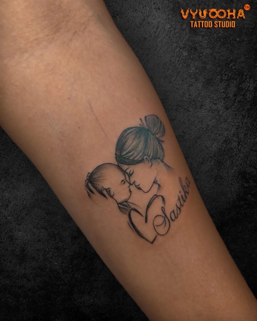 This tattoo beautifully illustrates a mother and child sharing an intimate moment—foreheads and noses touching in affection. The addition of the name “Sastika” personalizes the design, grounding the art in real-life love. A small heart further emphasizes the bond, adding emotional symbolism.