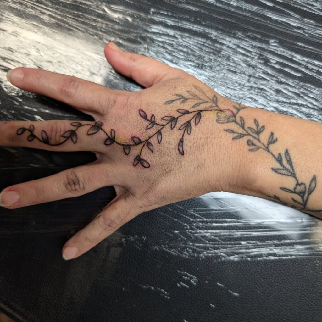 This tattoo wraps delicately around the hand, featuring trailing vines with small leaves in a continuous, flowing design. Though not explicitly lettered with “mom,” its organic imagery can symbolize growth, nurturing, and the natural bond of motherhood.