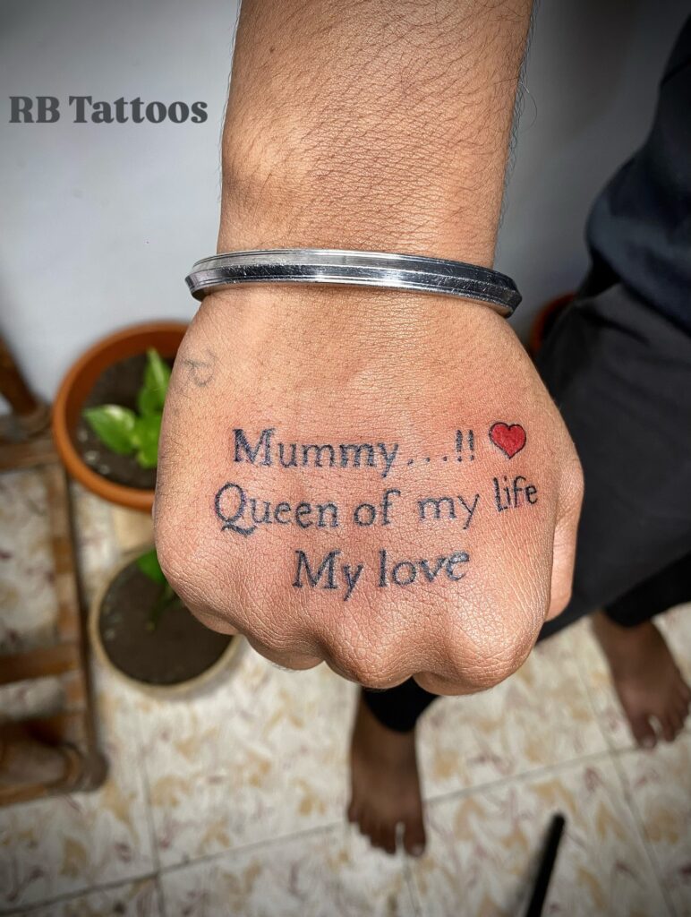 This bold hand tattoo carries a heartfelt message: “Mummy…!! Queen of my life, My love.” Accompanied by a small red heart, it directly communicates admiration, gratitude, and devotion. The hand placement makes the message impossible to miss, showing pride in acknowledging a mother’s significance.