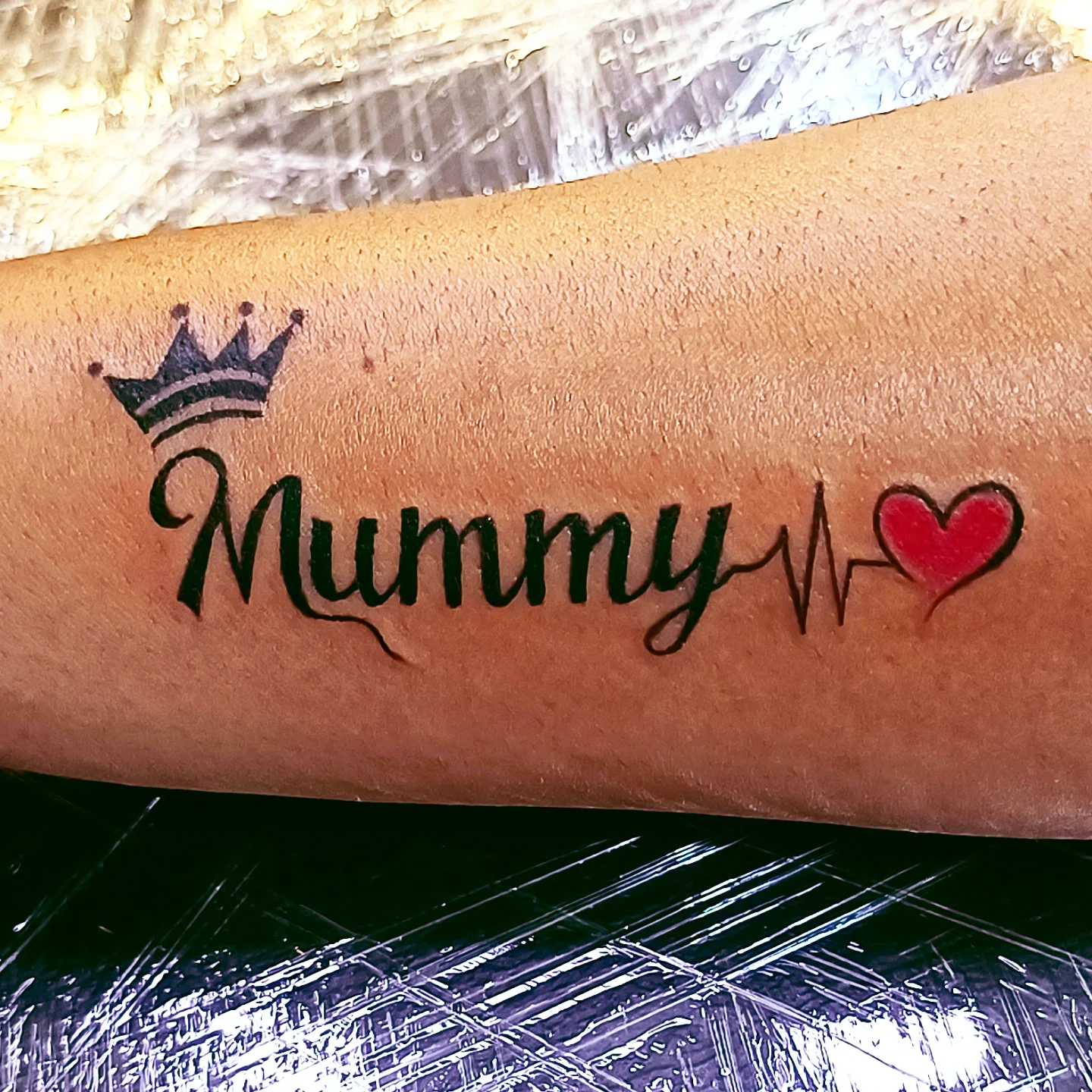 This tattoo features the word “Mummy” crowned with a regal tiara and followed by a red heart tied to a heartbeat line. The design symbolizes how mothers are both queens and lifelines, central to their children’s existence.