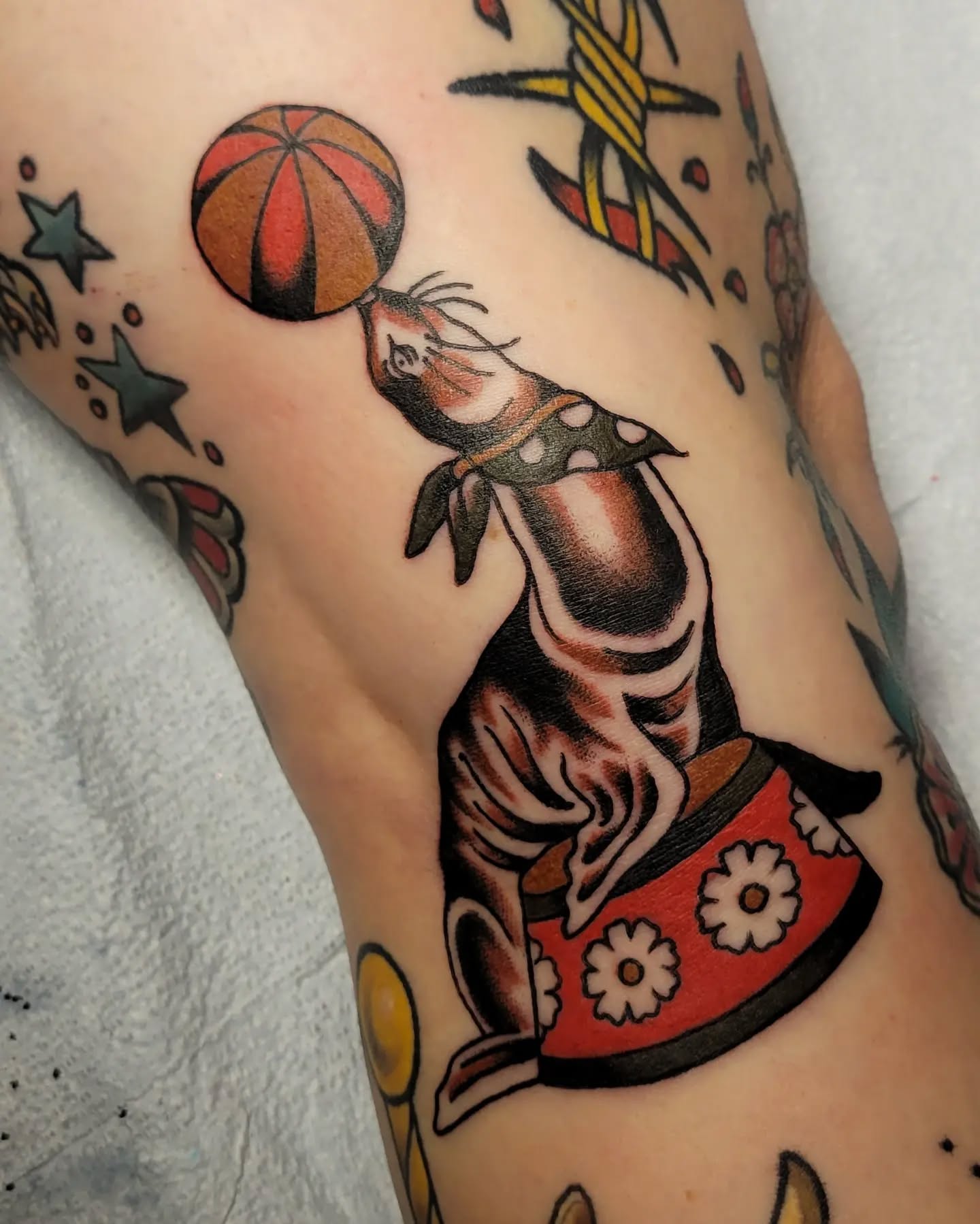 - Description: This bold and playful seal tattoo embodies the vintage charm of circus aesthetics. The strong linework and vibrant color palette give it a timeless feel, while the circus ball adds an element of whimsy. Seals are often associated with adaptability and joy, making this tattoo perfect for those who embrace life’s ups and downs with resilience. The traditional shading and classic design make it stand out while keeping it classy. This tattoo works well on the arm or calf, adding a fun yet sophisticated touch to any collection.