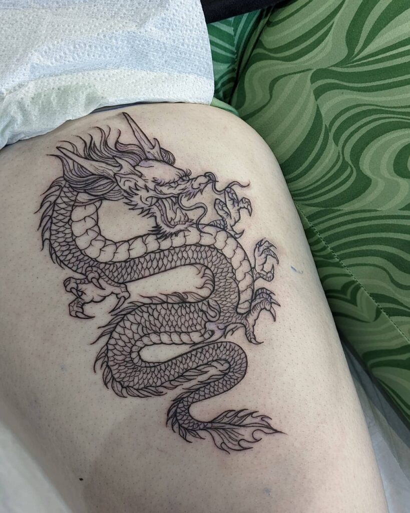 - Description: This beautifully detailed dragon tattoo is a masterpiece of fine-line artistry. The intricate scales, flowing whiskers, and fierce expression give it a sense of power and grace. Inspired by traditional Japanese tattooing, the dragon represents wisdom, strength, and protection. The placement on the thigh allows for an expansive design that showcases the tattoo’s stunning detail. The absence of color enhances its timeless appeal, making it an excellent choice for those who appreciate classy and sophisticated ink with deep cultural significance.