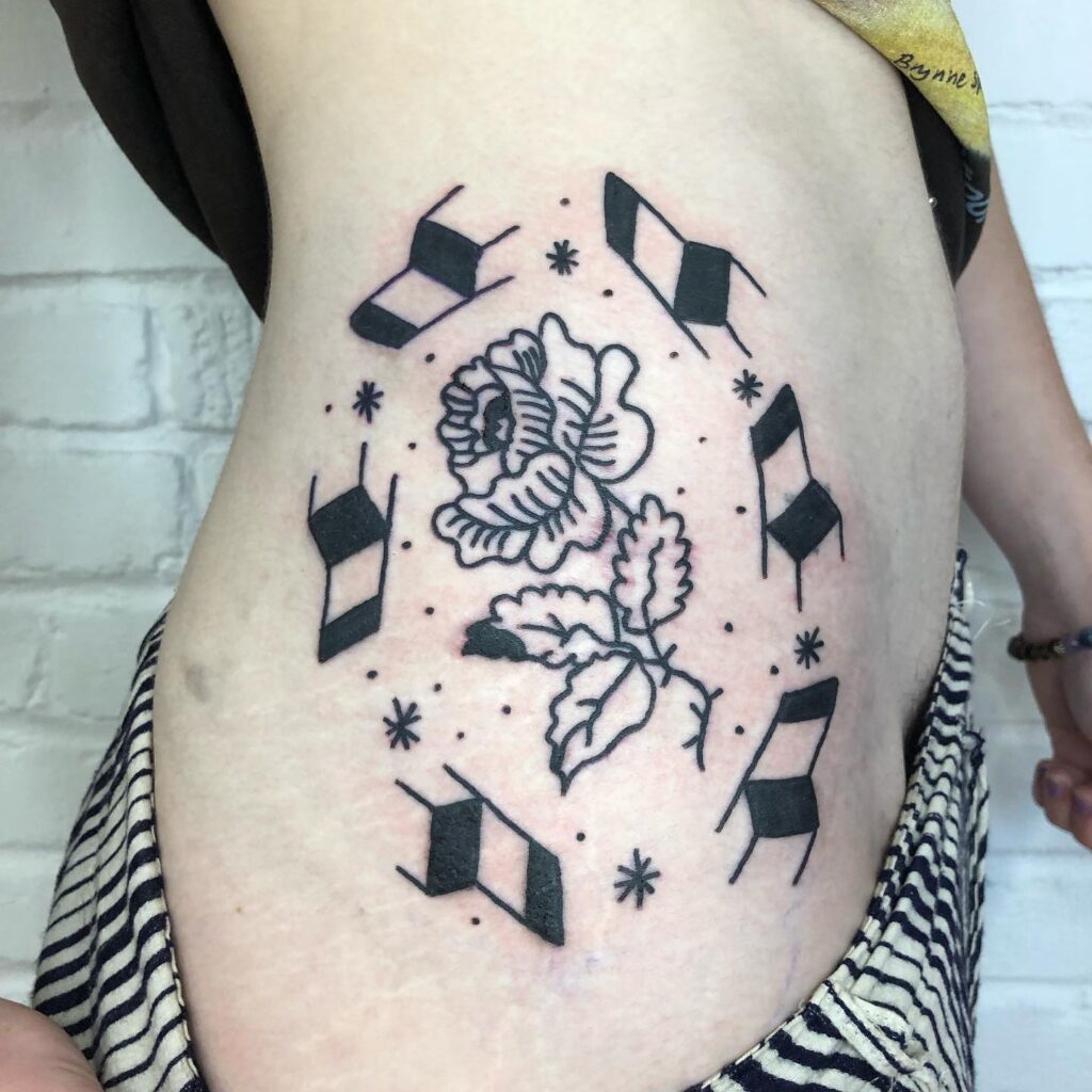 - Description: This geometric floral tattoo blends abstract elements with delicate floral linework, creating a stunning and classy composition. The bold black ink shapes frame a beautifully detailed rose, symbolizing balance between structure and organic growth. The placement on the ribs enhances its graceful appeal, making it a perfect design for those who love artistic tattoos that carry deeper meanings. The minimal color palette keeps it sophisticated, ensuring a timeless, elegant look.