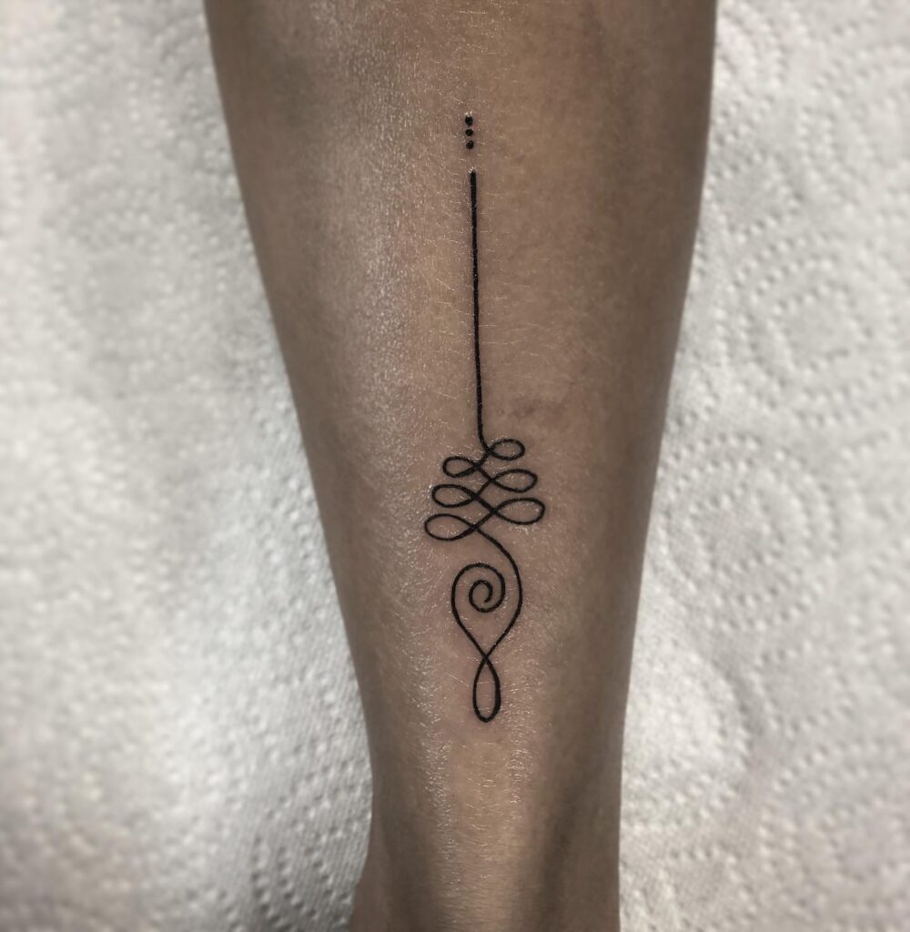 - Description: This intricate yet simple tattoo features an abstract fine-line design, radiating an air of mystery and elegance. The symmetry and fluid curves create a visually appealing balance, making it an ideal choice for those who prefer understated yet classy tattoos. This design works well on the forearm or wrist, offering a minimalist yet deeply symbolic piece. Whether representing personal strength, spirituality, or aesthetic preference, this tattoo embodies refined beauty in a subtle way.