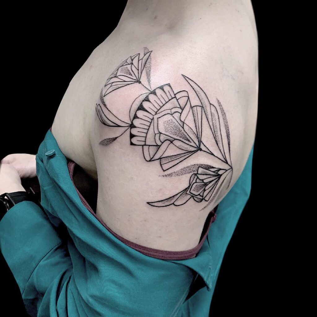 - Description: This stunning floral tattoo uses geometric elements and dotwork shading to create a sophisticated and modern composition. The delicate, flowing flowers blend seamlessly into the shoulder, making it a perfect placement for those who want an elegant and natural-looking tattoo. The intricate details add depth, while the negative space ensures a soft and refined look. This tattoo is perfect for those who appreciate artistic designs that merge nature with contemporary aesthetics.