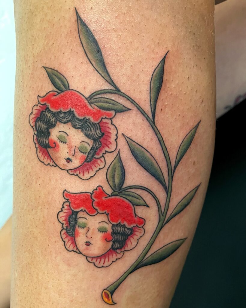 - Description: This striking tattoo blends vintage beauty with botanical elements, depicting two delicate faces surrounded by vibrant red flowers. The intricate detailing, soft shading, and bold colors give it a timeless, elegant appeal. Inspired by classic neo-traditional tattooing, this design symbolizes femininity, nostalgia, and the beauty of nature. The placement on the arm makes it a perfect statement piece, allowing the design to flow naturally. Whether you’re drawn to floral tattoos or love old-school aesthetics with a modern touch, this design beautifully merges both worlds into a stunning and classy piece of ink.