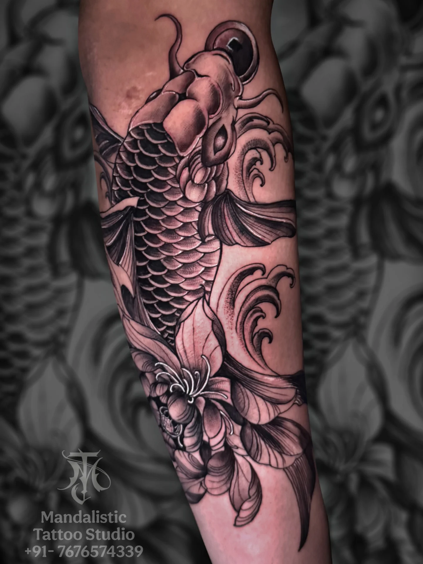 For women, this piece conveys strength with elegance, combining feminine floral softness with the koi’s resilient nature. The deep contrasts and detailed shading make it a timeless design, perfect for those who want a tattoo that tells a story of transformation and inner growth.