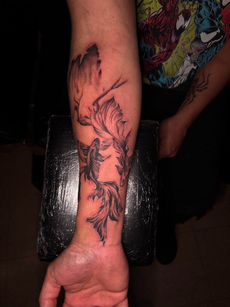 Koi tattoos can be designed as single fish, pairs, or as part of a yin-yang composition to symbolize balance. Popular placements include the arm, shoulder, back, or thigh, where the fish’s flowing lines can move naturally with the body.