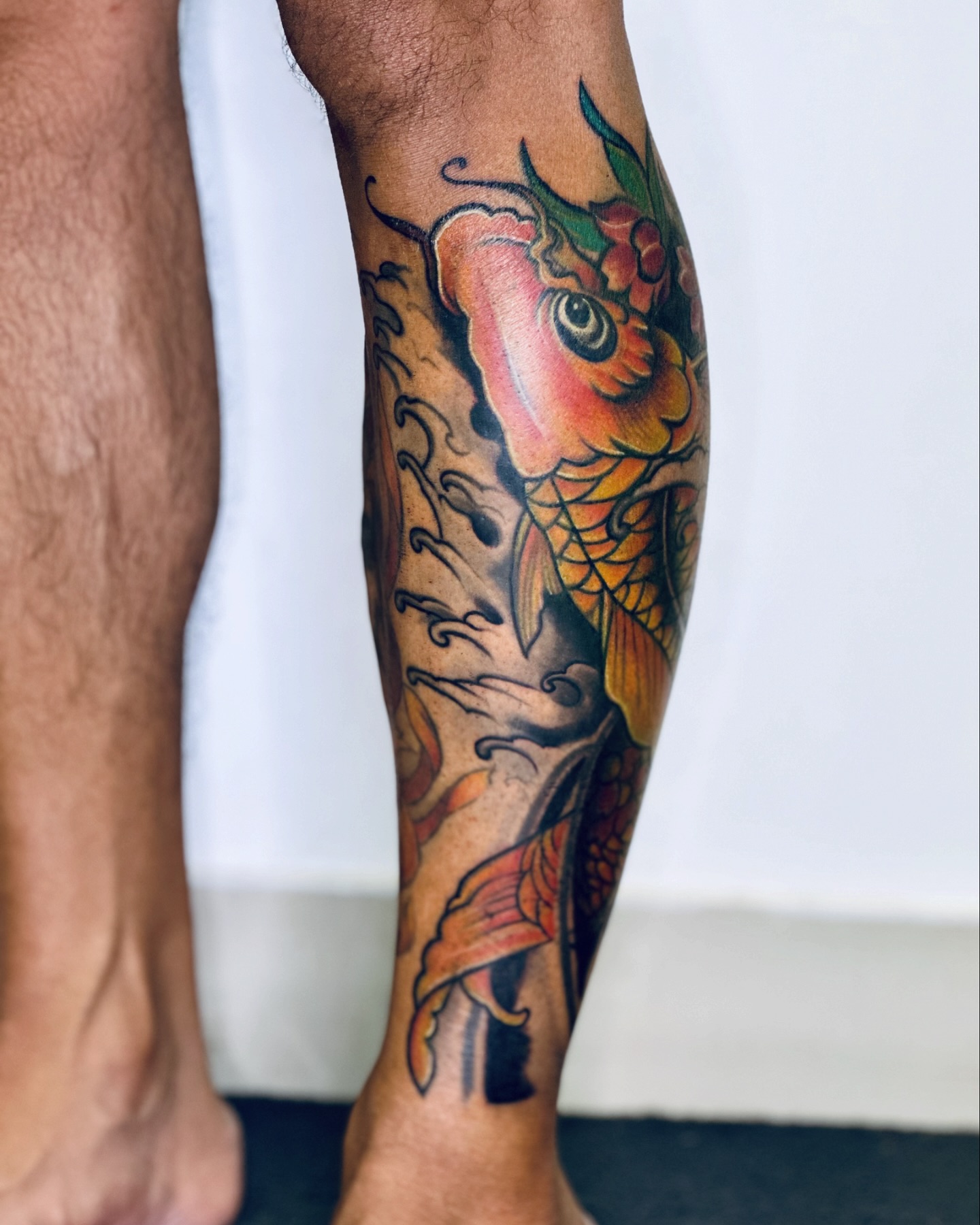 This colorful koi tattoo bursts with energy through its vivid orange, yellow, and red hues. Surrounded by waves, it captures movement and life, symbolizing prosperity, courage, and determination. The bright palette makes the koi look alive, glowing with positivity and strength.
