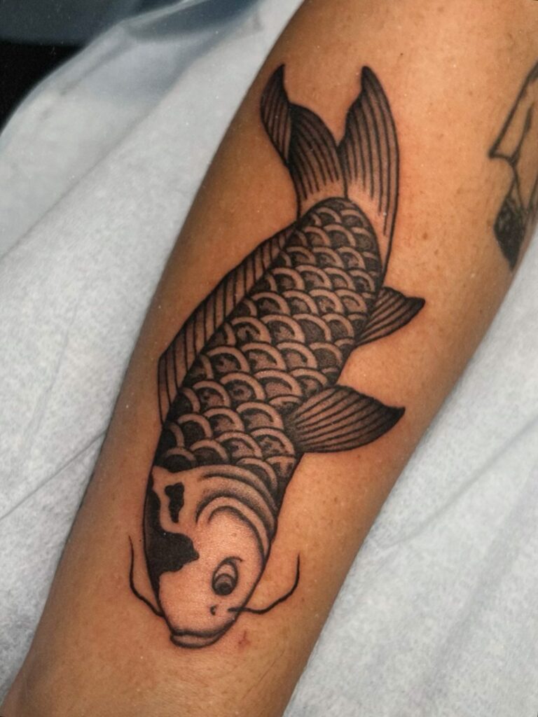 This koi fish tattoo is defined by its fine lines and delicate shading. Its minimalist style highlights the fish’s graceful movement without the need for excessive detail. The flow of the fins gives it a light, almost ethereal appearance, symbolizing tranquility and perseverance.