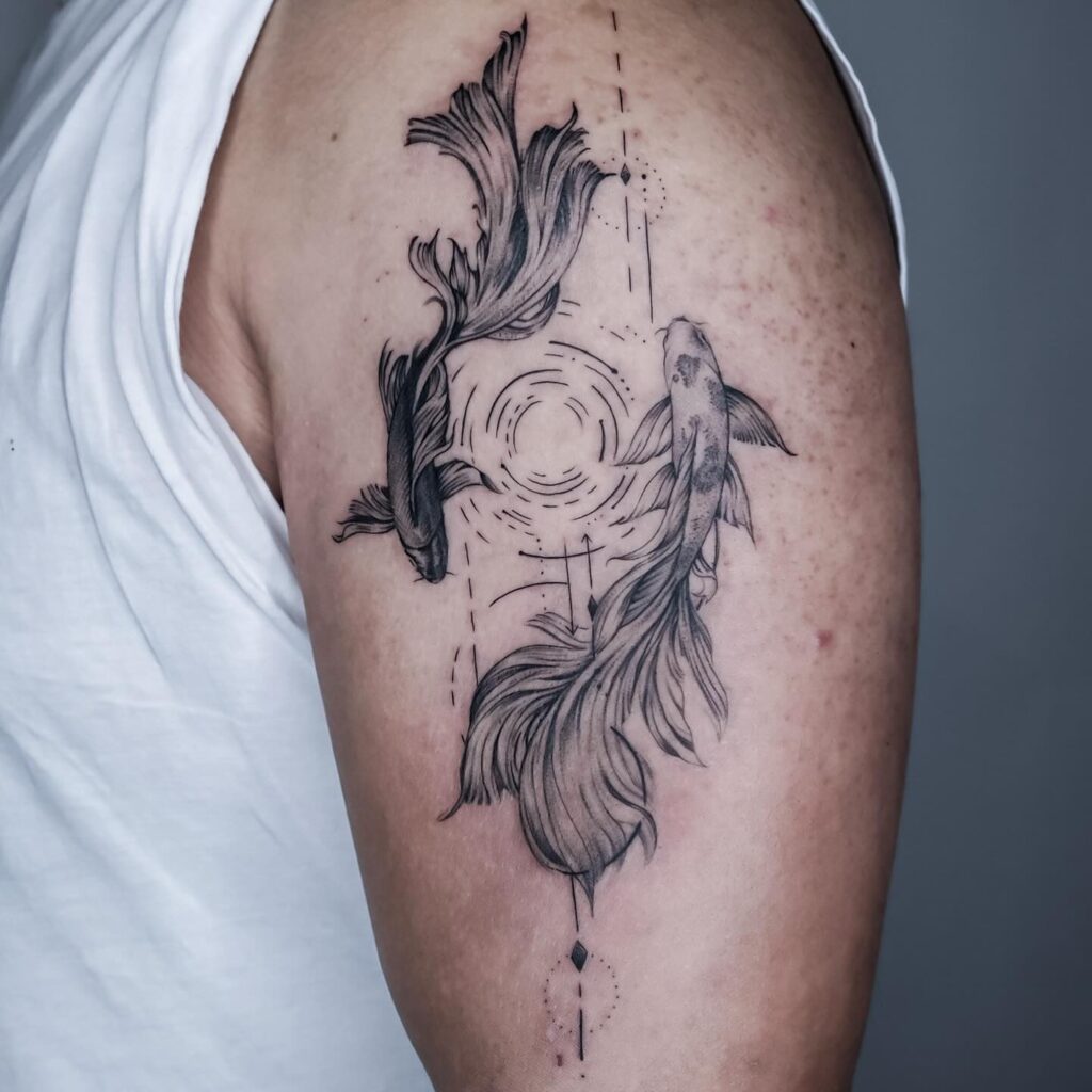 This tattoo depicts two koi fish circling each other in a yin-yang formation, symbolizing balance, harmony, and duality in life. The fine line detailing and flowing fins create an elegant, almost celestial effect, emphasizing unity and the cycle of life.