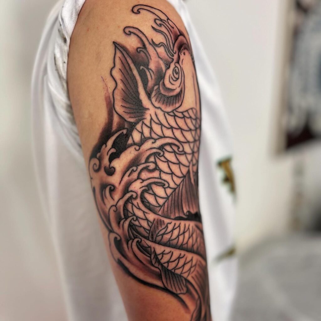 This koi tattoo is rendered in black and grey, emphasizing fine details and fluid wave patterns. The shading creates dimension and gives the fish a lifelike, dynamic presence. It symbolizes perseverance, ambition, and the strength to rise above adversity, much like koi swimming upstream.