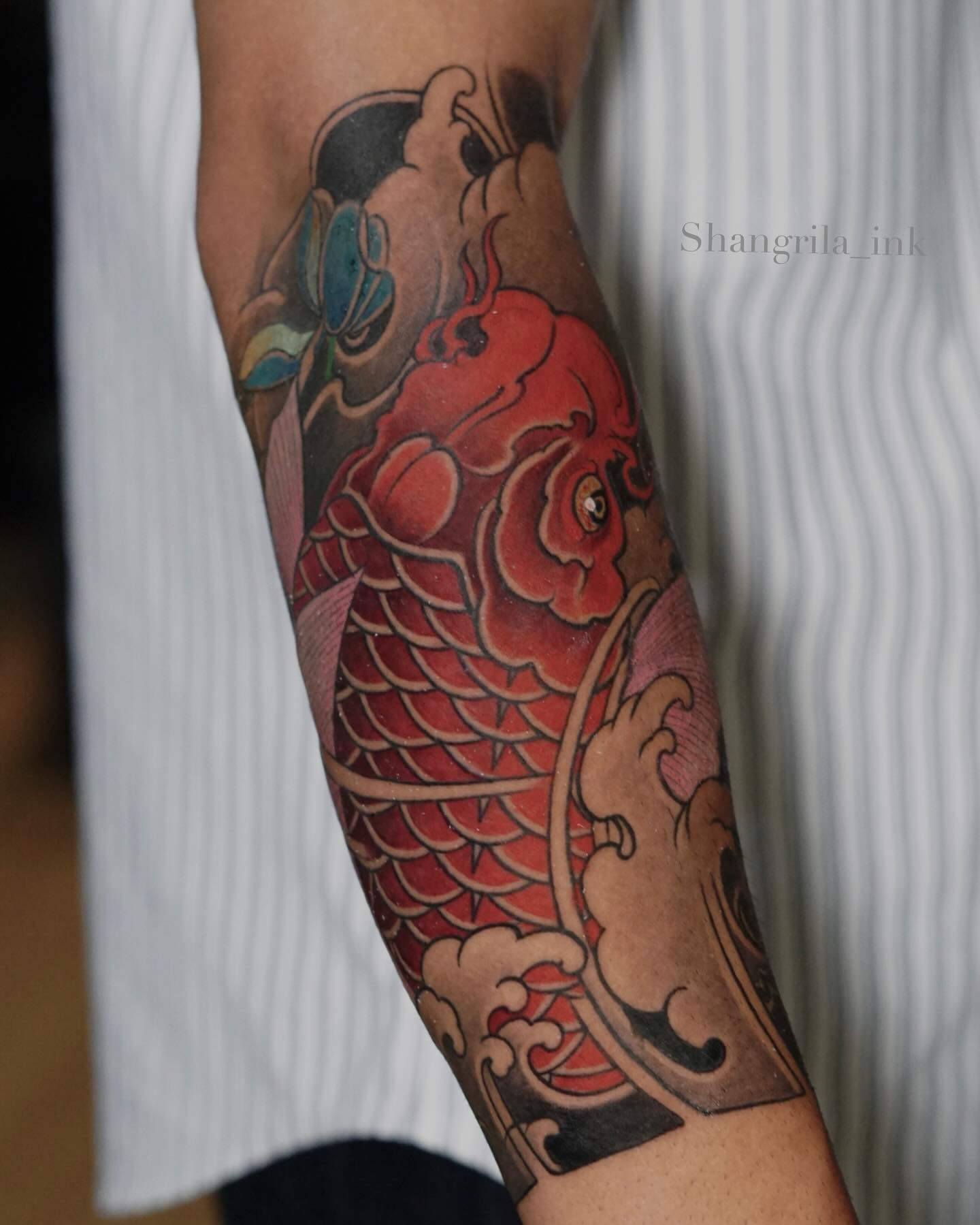 This half-sleeve koi tattoo beautifully blends black, grey, and fiery red tones. The koi swims powerfully through swirling waves and flowers, symbolizing ambition and the courage to rise above adversity. The bold contrast between the koi’s vibrant colors and the dark background adds dramatic depth.