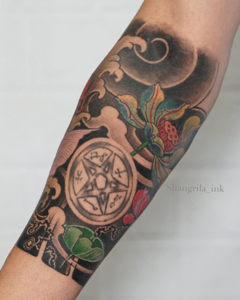 This tattoo combines a koi fish with lotus flowers and a pentagram symbol, blending spiritual imagery with traditional Japanese tattoo art. The bold use of black shading contrasts with vibrant greens and reds, creating a design full of mystery and depth. The lotus signifies purity, while the koi represents perseverance and transformation.