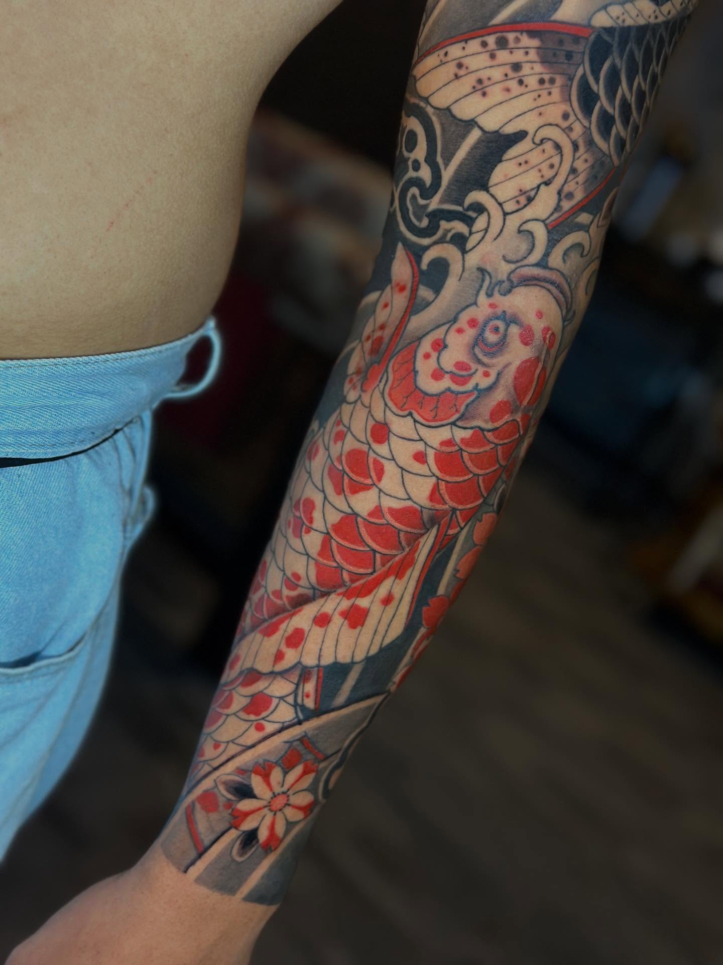 4. Sleeve-Style Koi Fish Tattoo with Red Accents