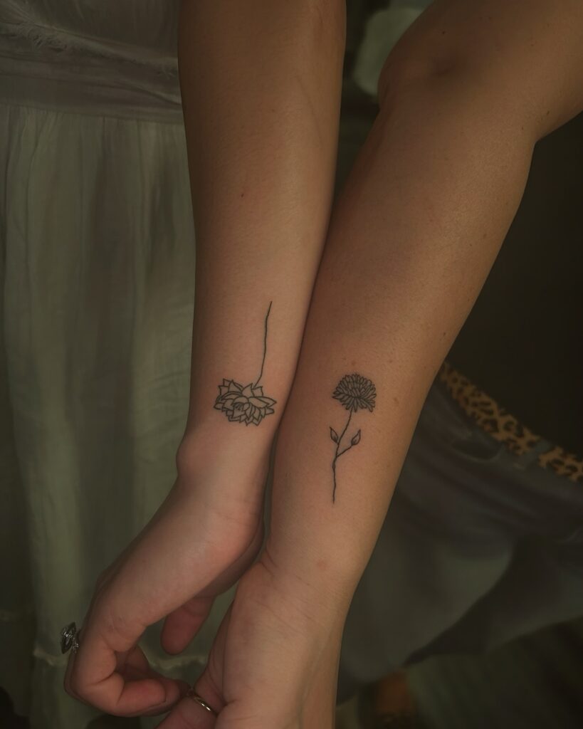 These matching floral tattoos capture the beauty of growth and love between mother and daughter. The fine-line style makes the flowers appear delicate and graceful, symbolizing a nurturing bond that continues to bloom through the years.