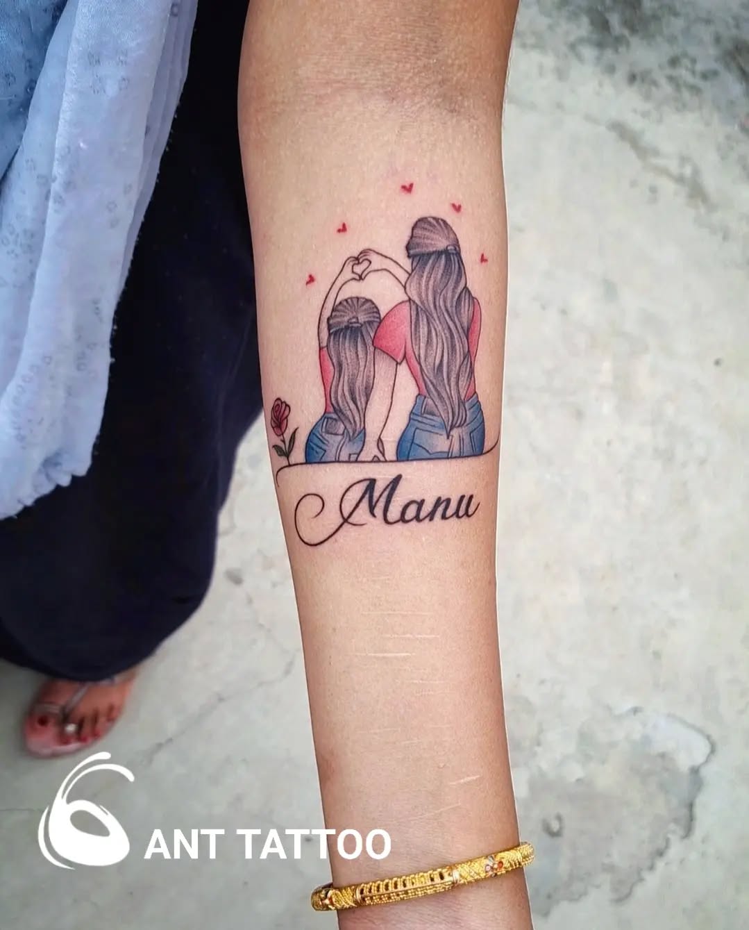 This charming tattoo portrays a mom and daughter sitting side by side, forming a heart shape with their hands. The use of color adds a lively, heartwarming feel, and the name below personalizes the design, making it a one-of-a-kind tribute.