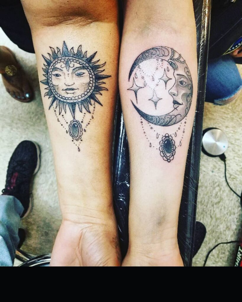 This striking pair of tattoos features a radiant sun on one arm and a dreamy crescent moon on the other, symbolizing the perfect balance of mother and daughter energy. The detailed linework and celestial elements give this design a mystical and artistic feel.