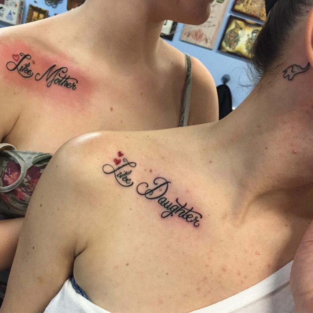 These collarbone tattoos say it all — “Like Mother” and “Like Daughter” in elegant script. The placement across the collarbone makes it beautifully visible and adds a touch of sophistication to the design.