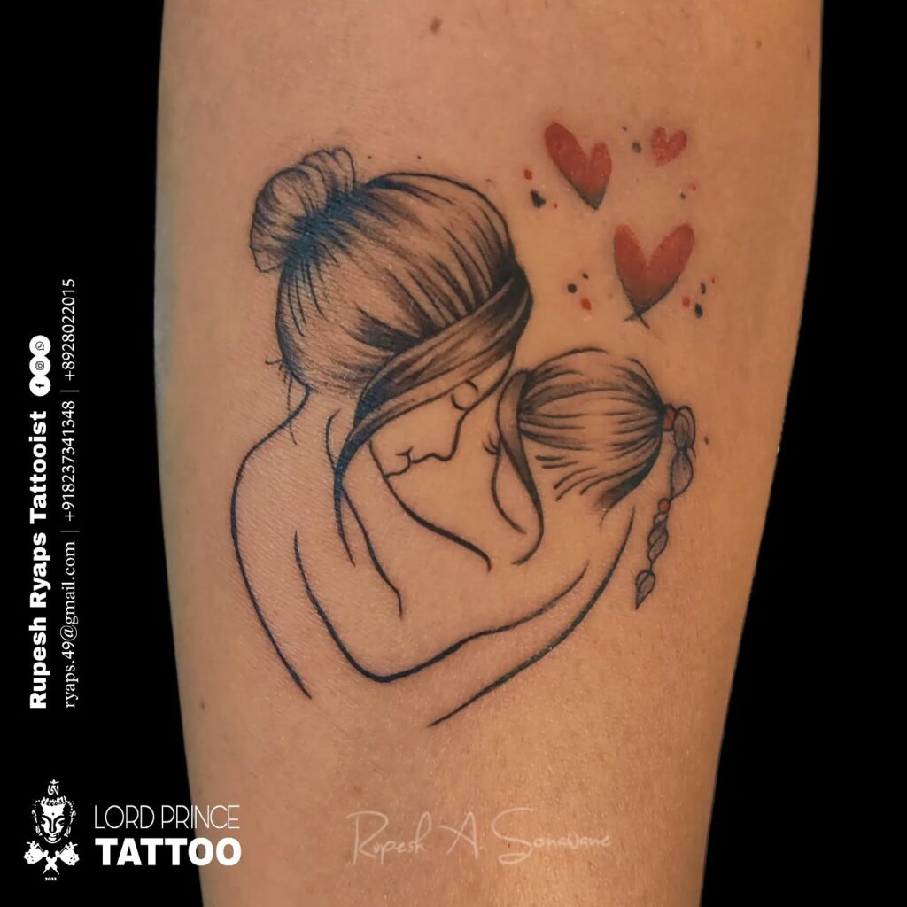 This tattoo beautifully captures a tender embrace between mother and daughter. The fine lines, soft shading, and tiny red hearts make the design feel warm and full of emotion.