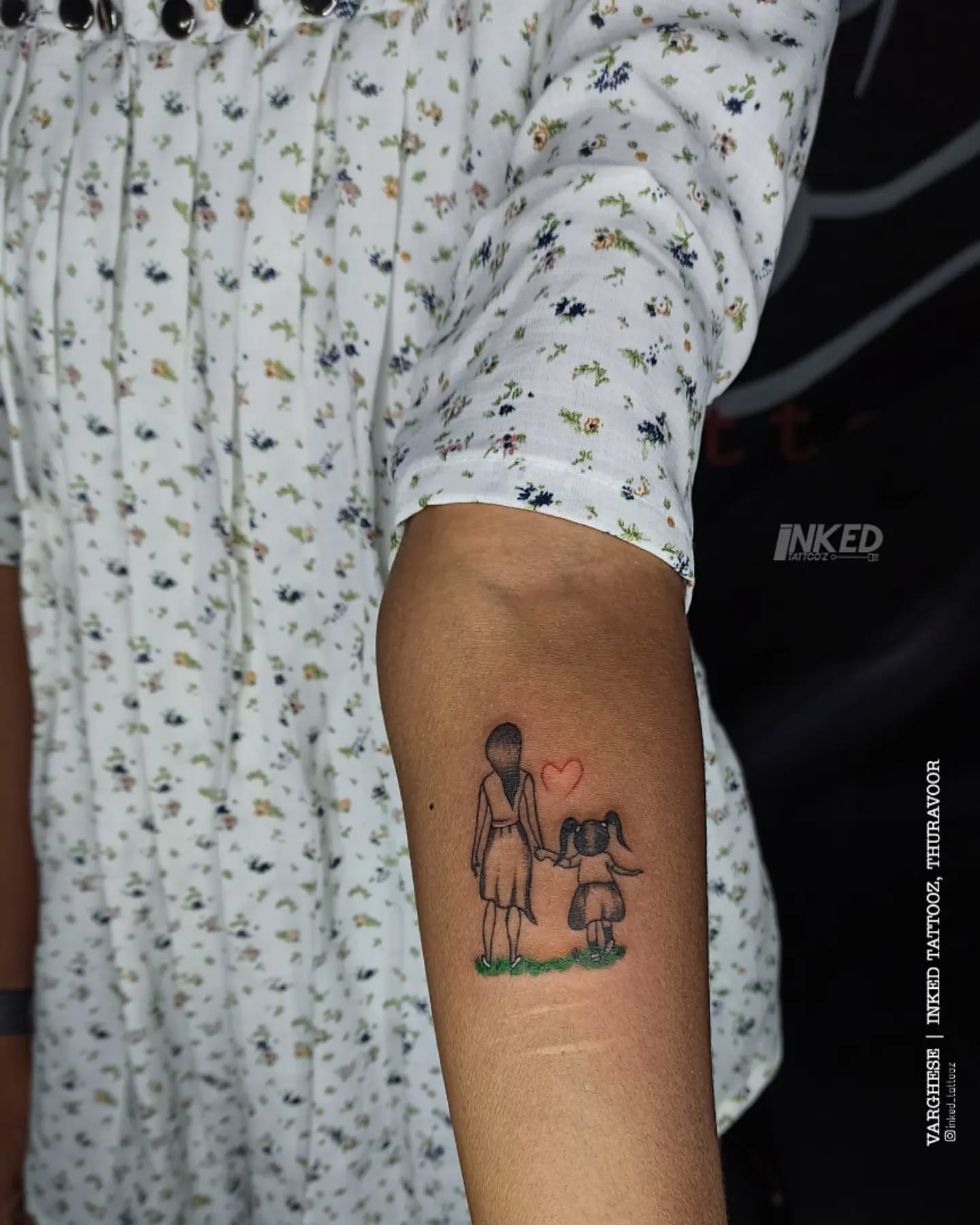 This minimalist tattoo shows a mother holding her daughter’s hand as they walk together, with a small red heart floating above them. The green grass detail adds a subtle touch of life and grounding to the design.