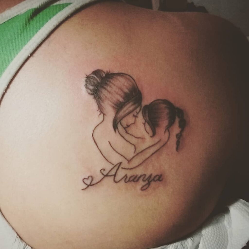 This tattoo captures a soft, emotional moment of a mother gently holding her daughter close. The fine-line art emphasizes their closeness, while the name “Aranya” beneath adds a deeply personal and meaningful touch.