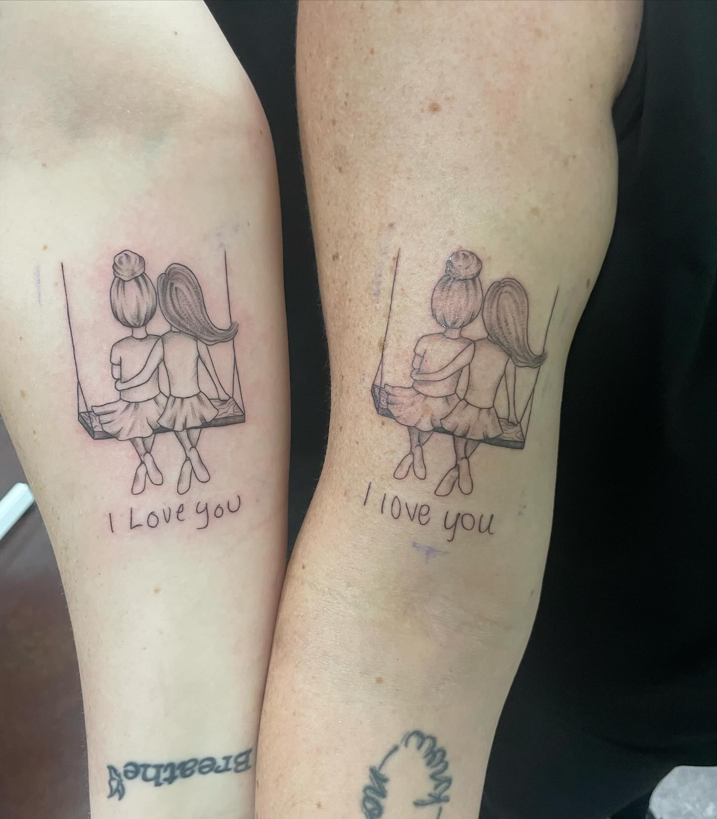 This matching tattoo shows a mom and daughter sitting side by side on a swing, with the words “I love you” underneath. The imagery feels nostalgic and peaceful, almost like capturing a favorite childhood memory on skin.
