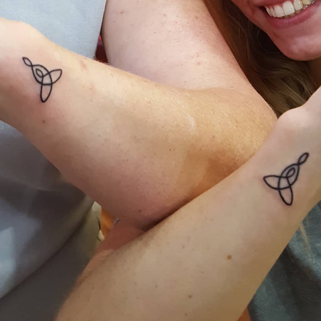 These identical tattoos feature a minimalist Celtic knot design, symbolizing eternity and unbreakable bonds. It’s a subtle and sophisticated choice for moms and daughters who want something symbolic but not too detailed.